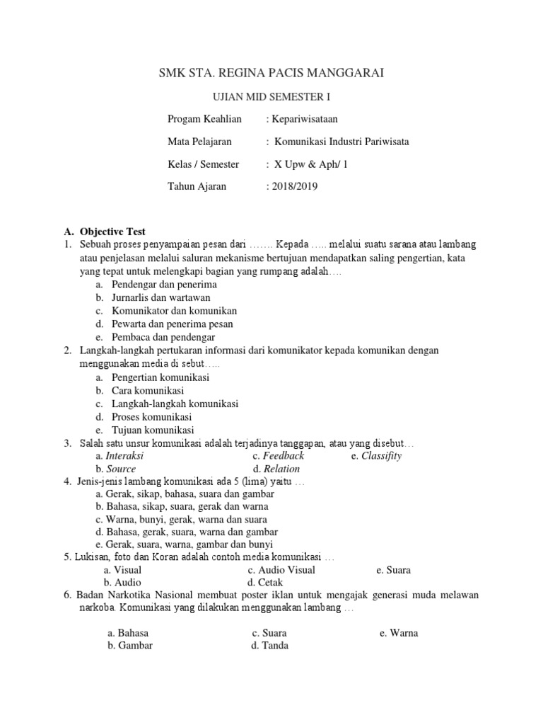 Soal Komunikasi Industri Pariwisata Kelas 1