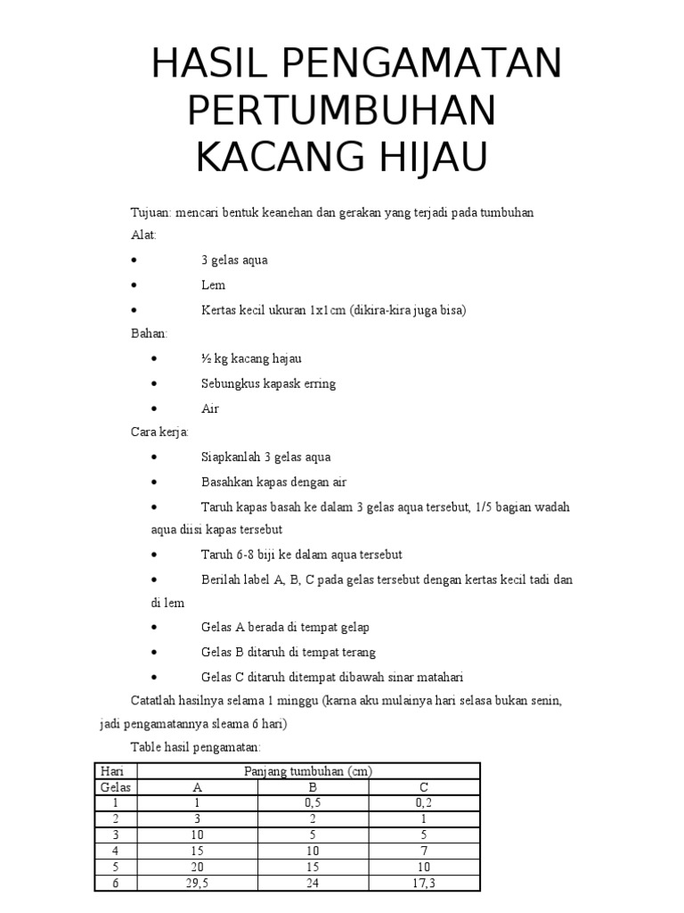 Tujuan dan Manfaat Penelitian Tujuan PenelitianTujuan kami melakukan penelitian ini adalah sebagai berikut. 10 Agustus 2015 16 Agustus 2015 di SMAN 1 Padalarang. Laporan pengamatan Pertumbuhan Biji Kacang Hijau gambar full 1.