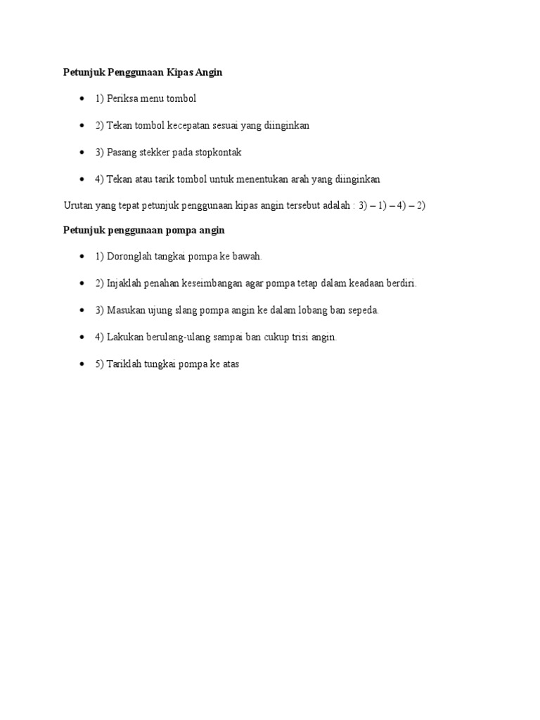 1 Lepaskan selang pompa dari pipa udara ban. Kalimat haruslah disusun singkatpadat dan informatif dengan mencantumkan hal hal yang di anggap penting dengan bahasa yang informatif. Petunjuk pemakaian Kipas Angin Listrik.