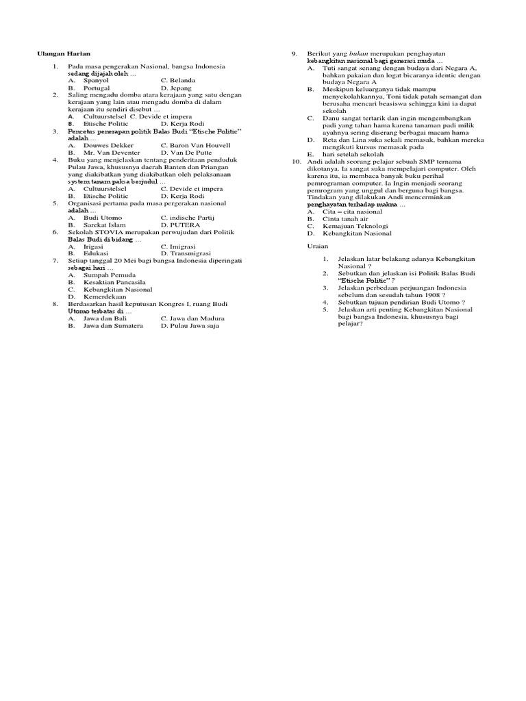 SOAL ULANGAN HARIAN TENTANG PROSES KEBANGKITAN NASIONAL. Penderitaan rakyat Indonesia terjadi dalam berbagai segi kehidupan. Latihan Soal Bab 4 Semangat Kebangkitan Nasional Tahun 1908.
