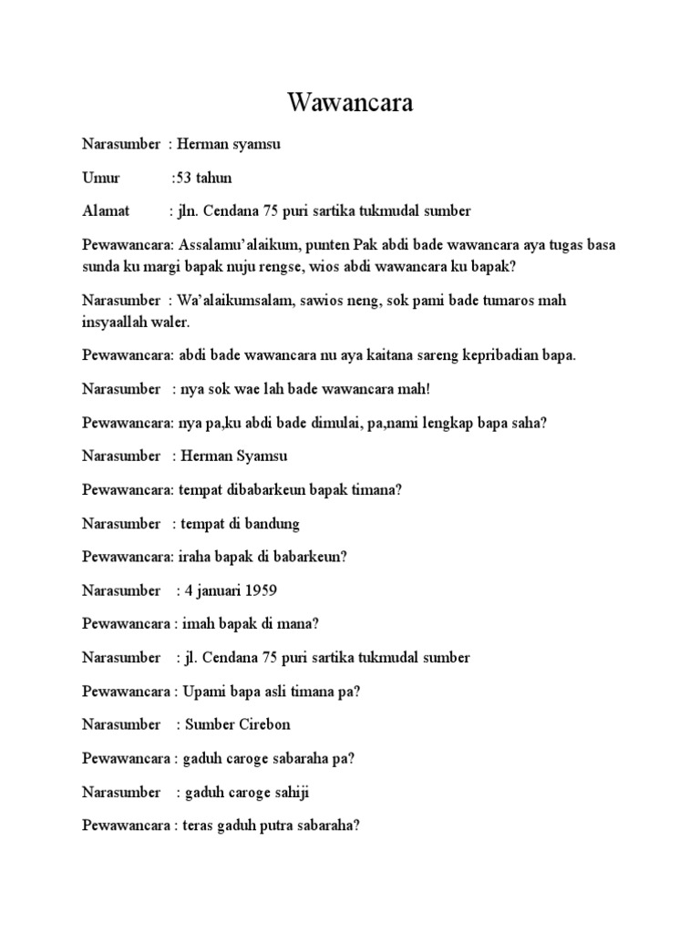 Sebelumnya mohon maaf apabila soal. 15 contoh wawancara bahasa sunda Oktober 31 2020 Hasil Ngawawancara Patugas Museum KAA Laporan disusun wangun tanya jawab Siswa. Contoh makalah wawancara bahasa sunda.